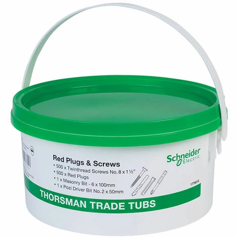 Tub of 500 quality red plastic wall plugs and twin-thread screws from Schneider Electric offering an easy-to use solution for the busy tradesman.