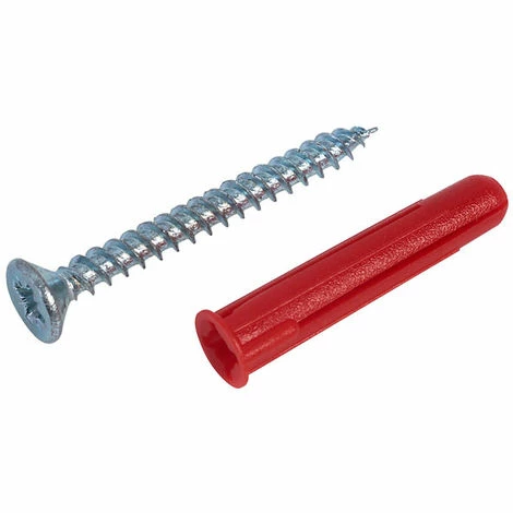Tub includes: 500 8 x 1½in twin thread screws; 500 red plastic wall plugs; 1 6 x 100mm masonry bit; 1 PZ2 x 50mm driver bit.