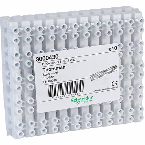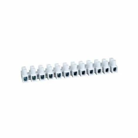 This 15A rated 12-way terminal strip is made from tough but flexible self-extinguishing white polypropylene. The design and construction of the terminal block makes it easy to snap-off the desired amount, making installation quicker and easier.