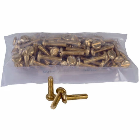 Brass M4 x 16mm machine screws from Schneider Electric with slotted pan heads, suitable for use in a number of electrical installations.