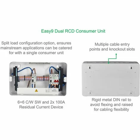The Schneider Electric EZ9ER6R6CMCU is a 6 + 6 Dual 100A residual current device, Metal Clad Consumer Unit