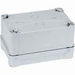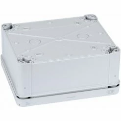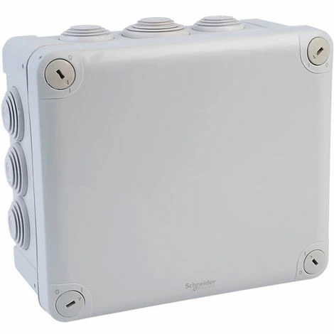 A 170 x 150 x 80mm rectangular junction box from Schneider Electric’s Mureva series with 10x Ø 25 and 2x Ø 32 cable entry grommets. The surface mounting box has a cover secured by quarter-turn screws and includes screw collar caps for extra protection of the screw heads.