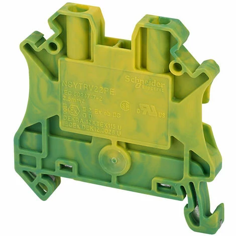 A green/yellow, DIN rail mounting 2.5mm² feed-through terminal from Schneider Electric’s Linergy TR range.