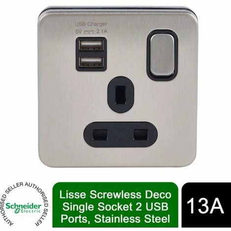 The Schneider GGBL30102USBABSSS is part of the new Schneider Lisse Screwless Deco range. This 1 gang single pole switched USB socket from Schneider has a stainless steel curved corner plate and rocker and is available with black inserts. The Schneider Lisse Screwless Deco range is an ultra-slim range ideally suited for new construction and refurbishment projects. Painting and decoration are made easy with the unique Screwless design and clipping system. This Screwless Deco range offers a Grid or Euro system to suit every individual’s needs.